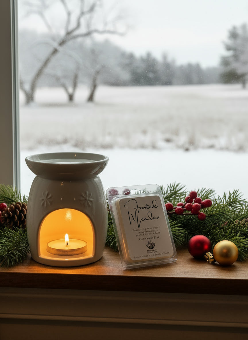 Wax Melt: Let your home glow with crisp calm. As it melts, Frosted Meadow releases fresh notes of greenery and mint balanced by soft musk, a peaceful scent for quiet winter moments.